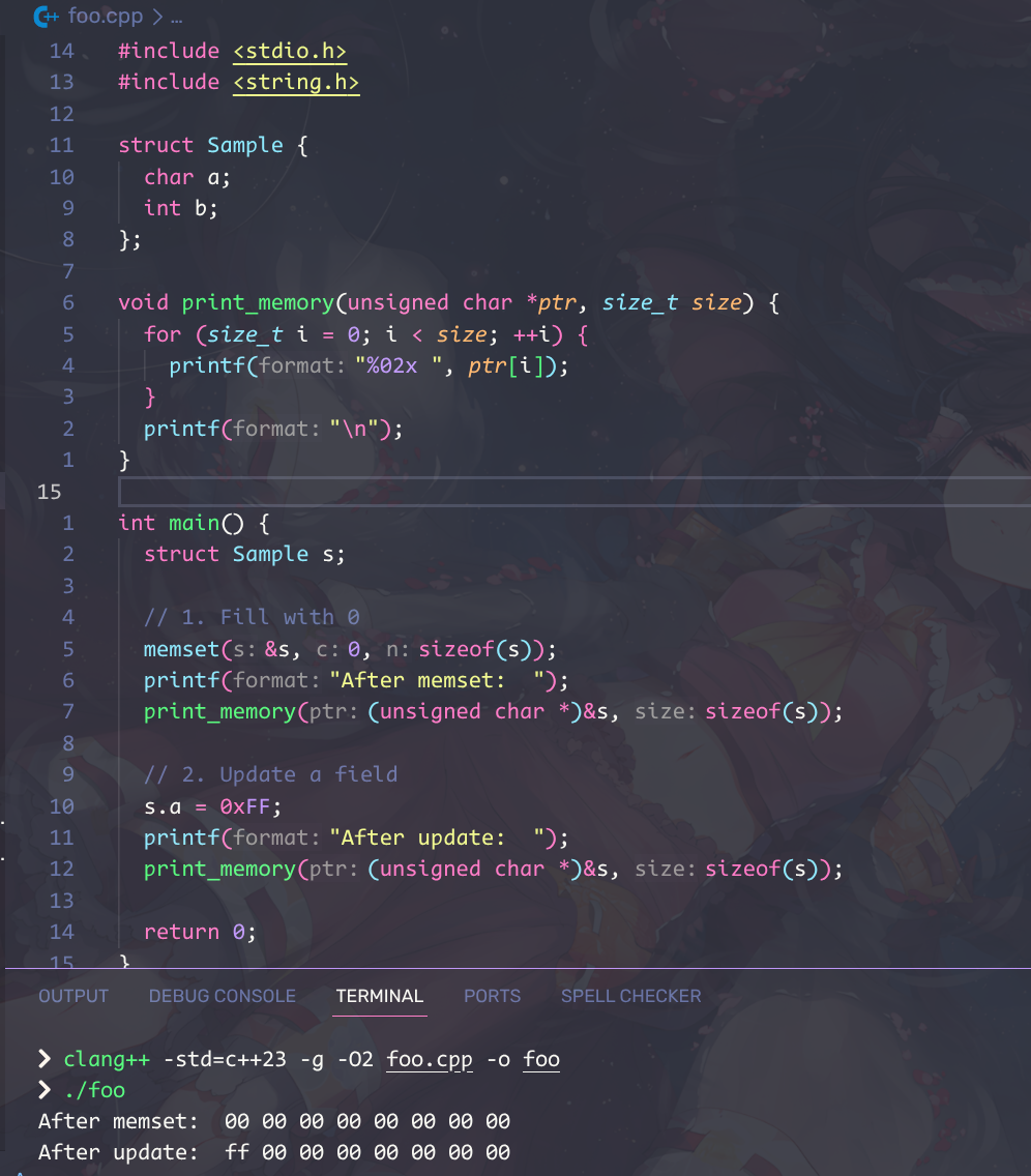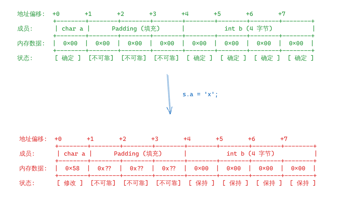 如图,无论是执行完 s.a = 'x'; 前后,填充位的值都不可靠。为什么呢,希腊奶。但既然标准这么规定了,就不要依赖这种行为(真不会依赖吗?)
